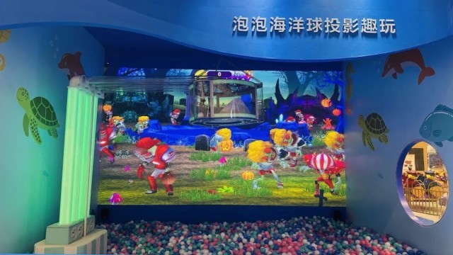 “泡泡海洋球投影趣玩”则凭借趣味十足的强互动体验,成为现场另一大“人气打卡点”。该方案采用1台20000流明*2*3的CB-PU2220B工程投影机搭配ELPLX02S镜头,无需复杂安装,即可实现无接触、强互动的墙面投射,支持“打地鼠”“打僵尸”“坦克大战”等多款卡通互动游戏。借助高速识别技术,设备可精准捕捉海洋球击打位置,命中瞬间即触发炫酷爆破动画、趣味音效与积分反馈,在轻松的游戏氛围中,充分激发参与者的探索欲和创造力,吸引了众多家庭的驻足和参与,现场孩童欢笑声不断。