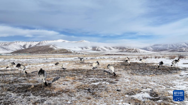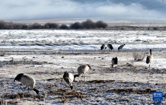 3月29日,黑颈鹤在四川省红原县的草原上觅食。