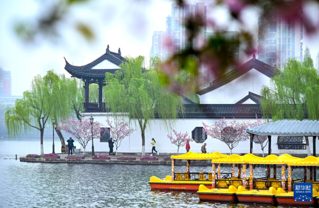 3月31日,游人在江苏南京莫愁湖公园赏景游玩。