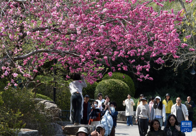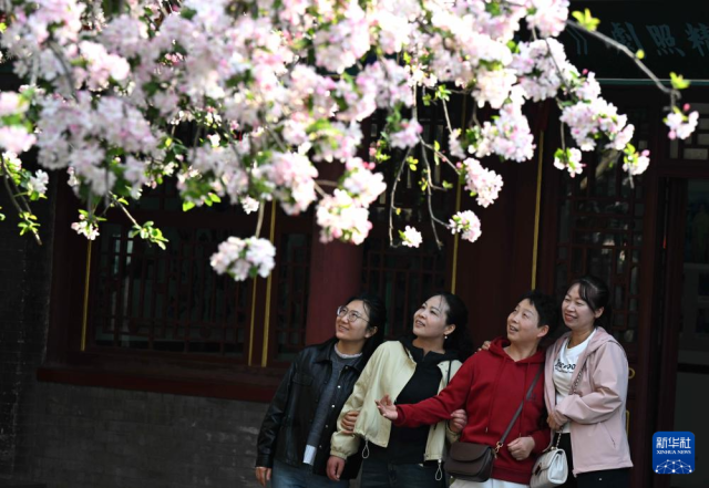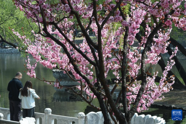 3月29日,游人在河北省石家庄市正定荣国府影视基地内赏花拍照。