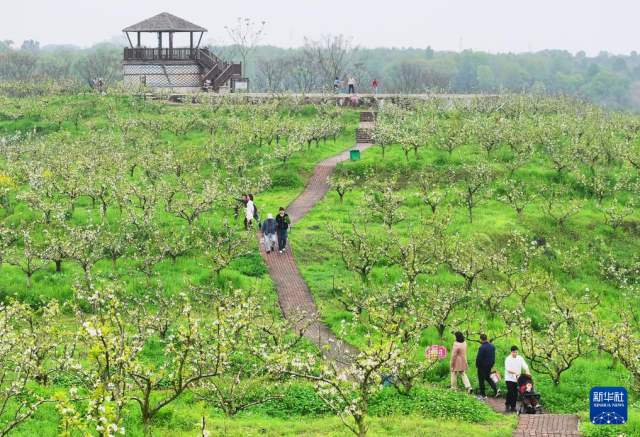 3月29日,游客在湖南省衡阳市珠晖区金甲梨园赏景游玩(无人机照片)。