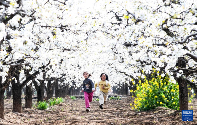 3月29日,小朋友在河南省济源市五龙口镇马村梨园赏花游玩。