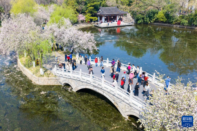 3月29日,游客在江苏南京莫愁湖公园赏花游玩(无人机照片)。