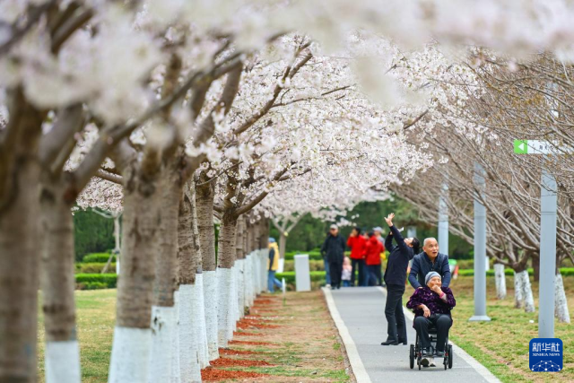 3月31日,人们在河北省石家庄市石津灌渠文化公园内赏花游玩。