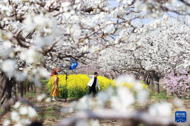 3月31日,游客在河北省邢台市内丘县大都城村果园内赏花游玩。