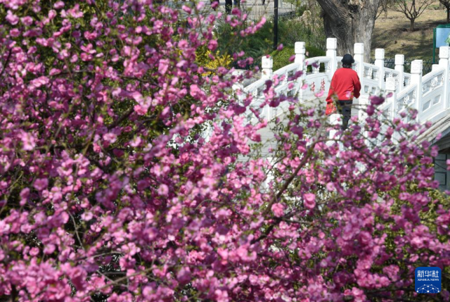 3月31日,游客在北京紫竹院公园游玩赏花。