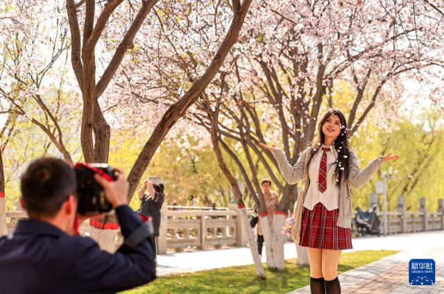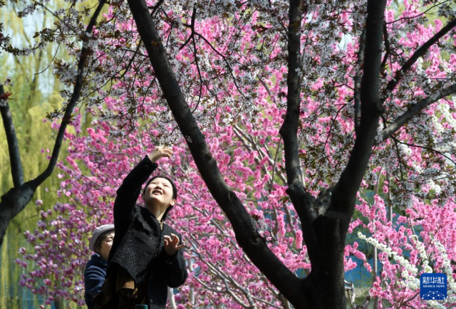 3月31日,游客在河北省石家庄市植物园拍照游玩。