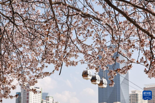 3月31日,在甘肃省兰州市城关区黄河风情线,游客乘坐缆车赏花游览。