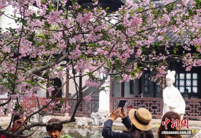 4月1日,江南古典名园南京莫愁湖公园内鲜花盛开,垂柳滴翠,花红柳绿展“画意江南”。