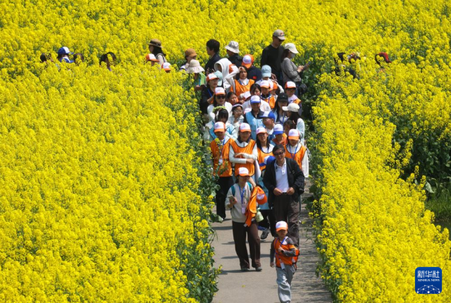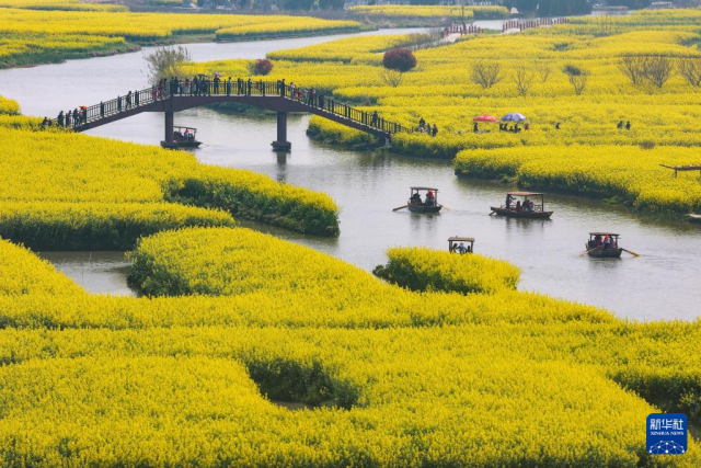 近日,江苏省多地油菜花已进入盛花期,金黄色的油菜花与纵横交错的河道构成“河有万湾多碧水,田无一垛不黄花”的春日画卷。游客或漫步或乘船,徜徉花海,欣赏美景,尽享春日美好。