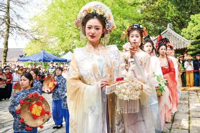 在浙江省湖州市南浔区善琏镇举行的第二十八届含山“轧蚕花”民俗文化活动(4月5日摄)。沈勇强摄