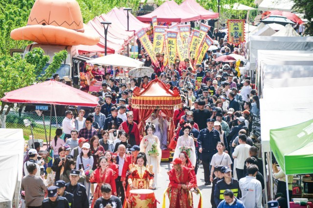 在浙江省湖州市南浔区善琏镇举行的第二十八届含山“轧蚕花”民俗文化活动现场(4月5日摄)。 沈勇强摄