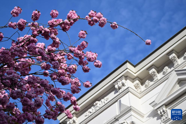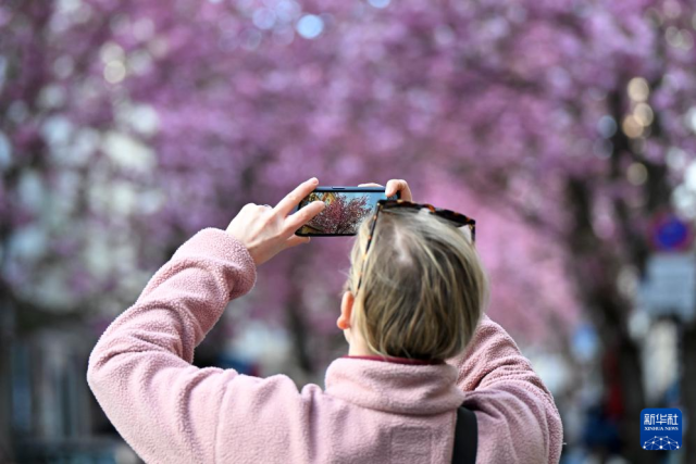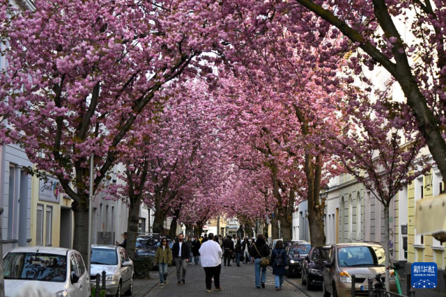 近日,德国西部城市波恩老城区樱花盛开,吸引了许多游人前来观赏。