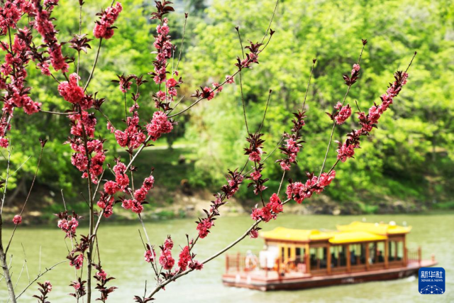 4月8日,游客乘坐画舫在江苏南京外秦淮河上赏景游玩。