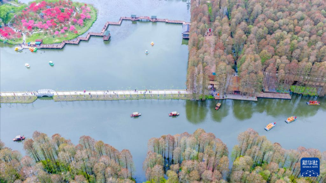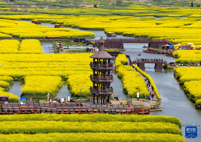 4月8日,游客在江苏省兴化市千垛景区赏花游玩(无人机照片)。