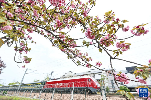 4月8日,在浙江省嘉兴市南湖区,列车从樱花树旁驶过。