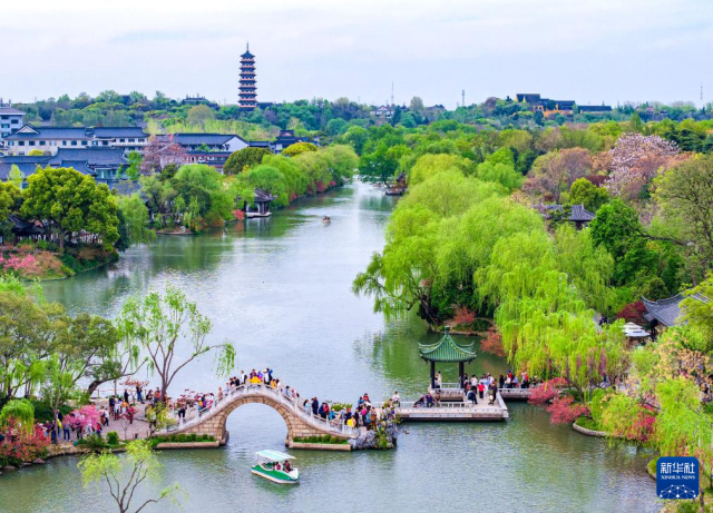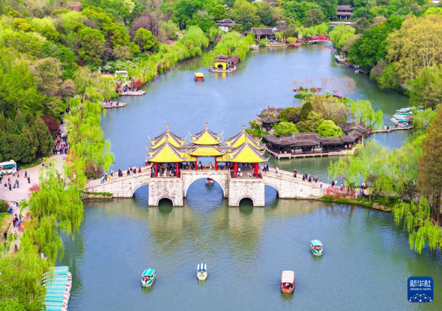 4月7日,游客在江苏省扬州市瘦西湖风景区游览(无人机照片)。