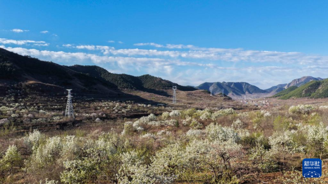 4月8日在河北省遵化市铁厂镇拍摄的梨树沟春景(无人机照片)。
