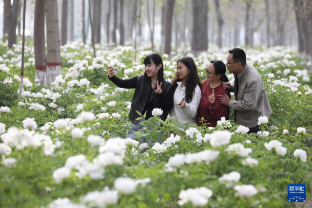 4月7日,游客在河南省焦作市温县国有实验林场芍药花海中赏花休闲。