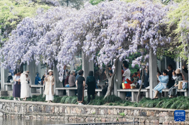 4月8日,人们在浙江大学华家池校区观赏盛开的紫藤花。