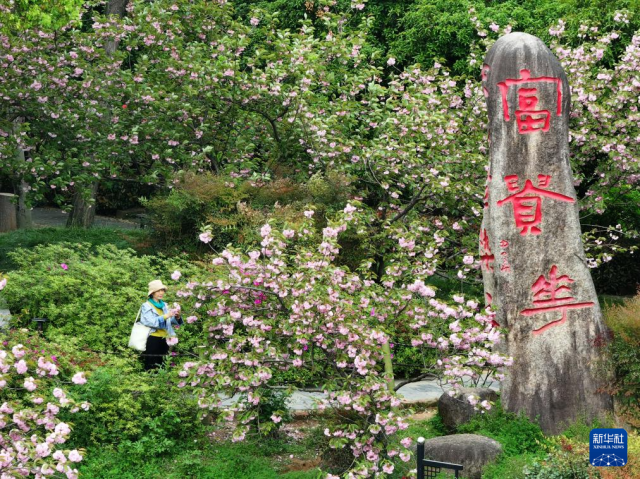4月8日,游人在湖北武汉东湖牡丹园赏花游览(无人机照片)。