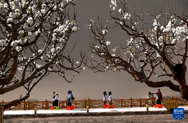 4月7日,北京市平谷区王辛庄镇农民在果园为桃树疏花。
