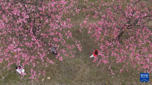 4月8日,游人在云南省腾冲市北海镇一片樱花树下打卡拍照(无人机照片)。