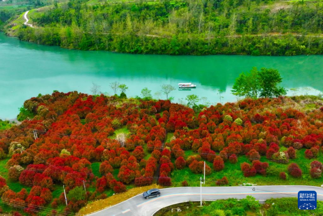 4月8日,村民乘坐过河渡船行驶在重庆市阿蓬江国家湿地公园阿蓬江上(无人机照片)。