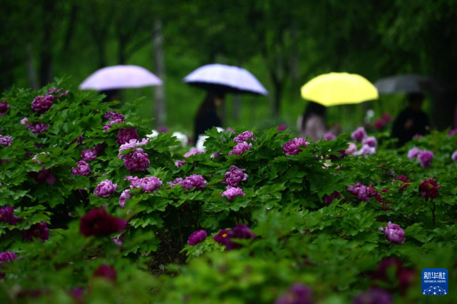 4月8日,游客在河南省驻马店市汝南县天中山文化园冒雨观赏牡丹花。