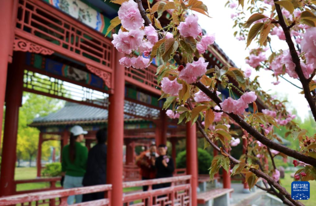4月8日,游客在河南省安阳市内黄县硝河游园打卡拍照。