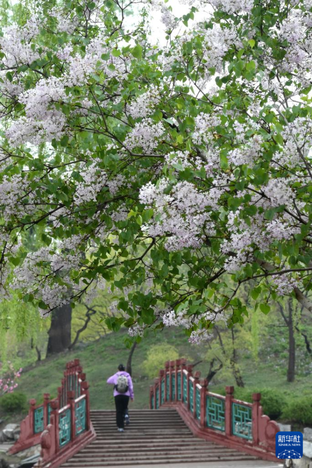 4月9日,游客在北京圆明园踏青赏花。