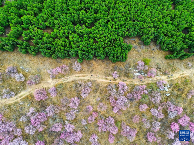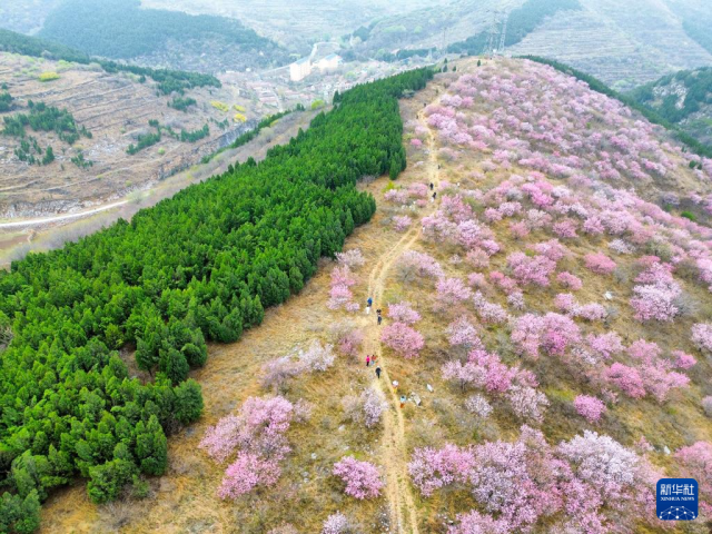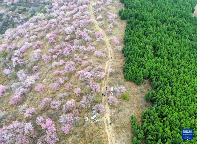 时下,山东省淄博市博山区石马镇上焦村桃花盛开,红粉色桃花撞色山脊另一侧的绿色松树,形成别样春日景象。