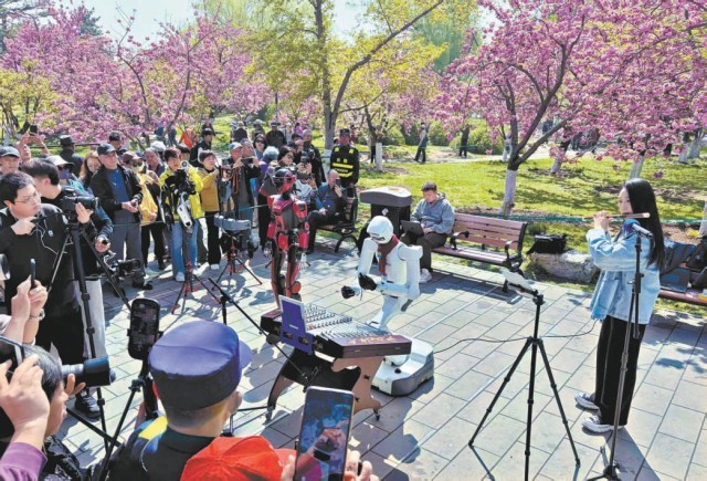 樱花树下,孙楚泊与机器人同奏。本报记者 刘平摄