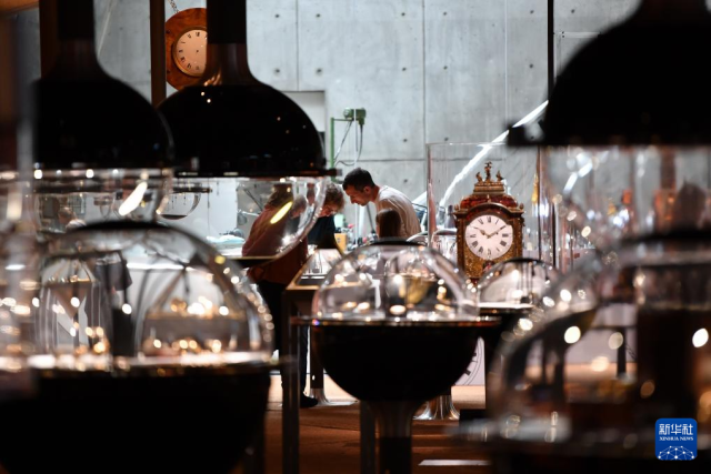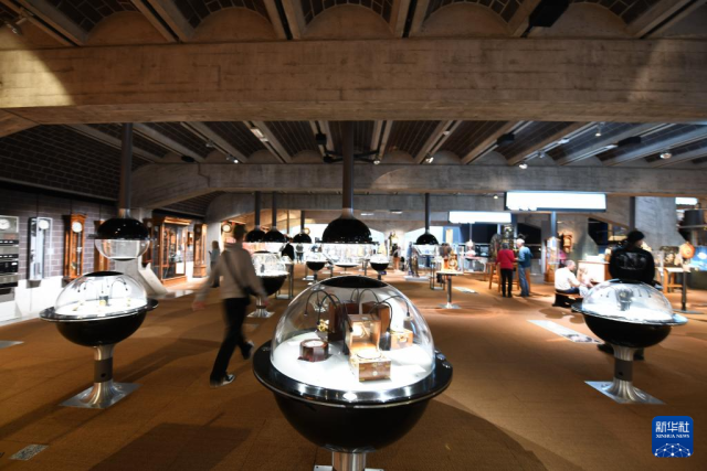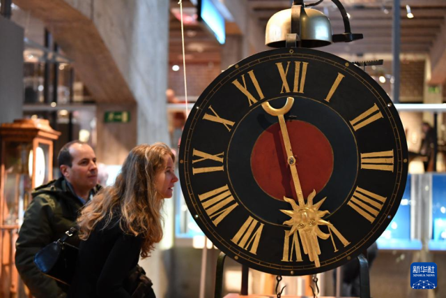 4月12日,人们在瑞士拉绍德封的国际钟表博物馆内观看展品。