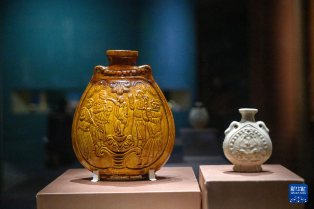 这是展出的白釉兽面纹双系扁壶(4月13日摄)。