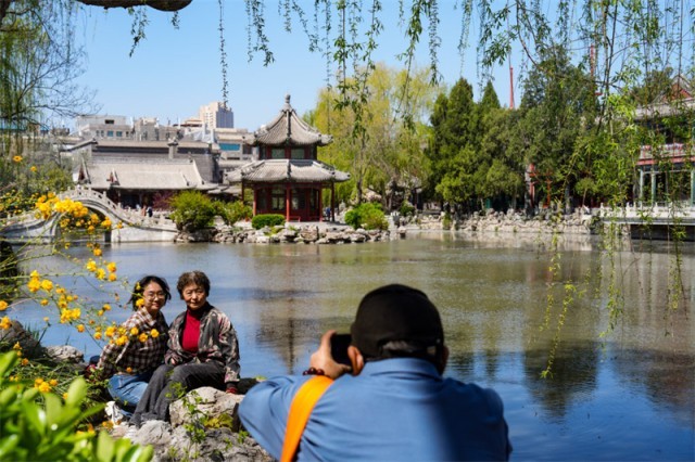 4月11日,游客在保定古莲花池赏景拍照。