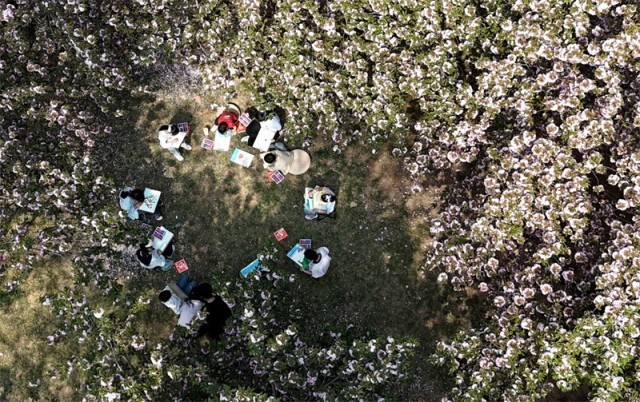 4月12日,孩子们在石家庄市栾城区樱花公园踏青赏花写生。