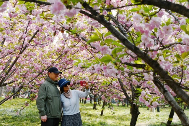 4月12日,游客在石家庄市栾城区樱花公园赏花拍照。