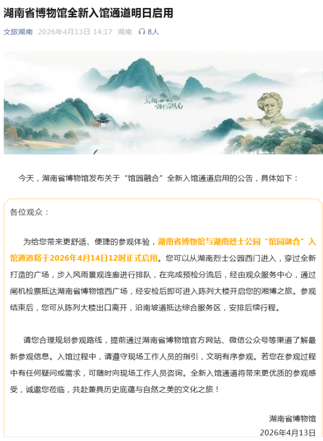 4月13日,湖南省博物馆对外发布关于“馆园融合”全新入馆通道启用的公告(以下简称《公告》)。《公告》称,湖南省博物馆与湖南烈士公园“馆园融合”入馆通道将于2026年4月14日12时正式启用。