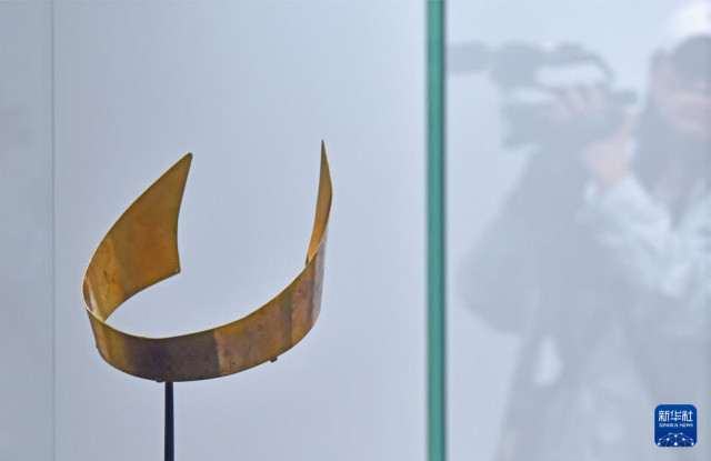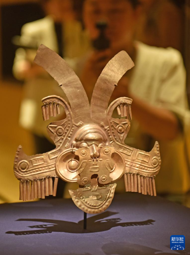 4月14日,媒体记者在拍摄哥伦比亚头饰。新华社记者 陈铎 摄