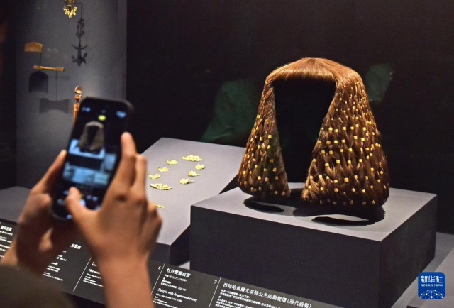 4月14日,媒体记者在拍摄一款头饰作品。新华社记者 陈铎 摄