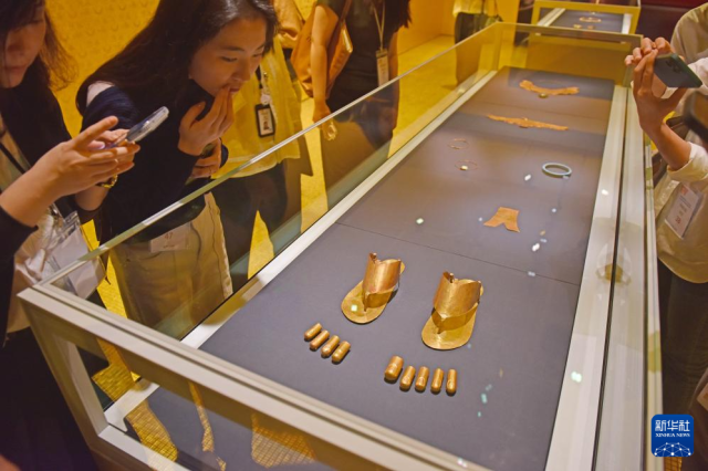4月14日,媒体记者在参观埃及脚趾套和拖鞋。新华社记者 陈铎 摄