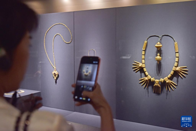 4月14日,媒体记者在参观一款项链。新华社记者 陈铎 摄