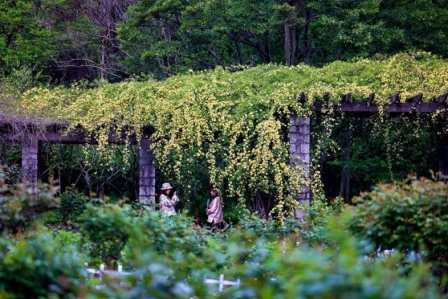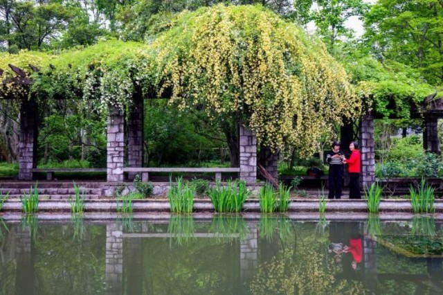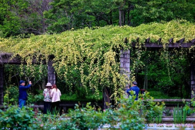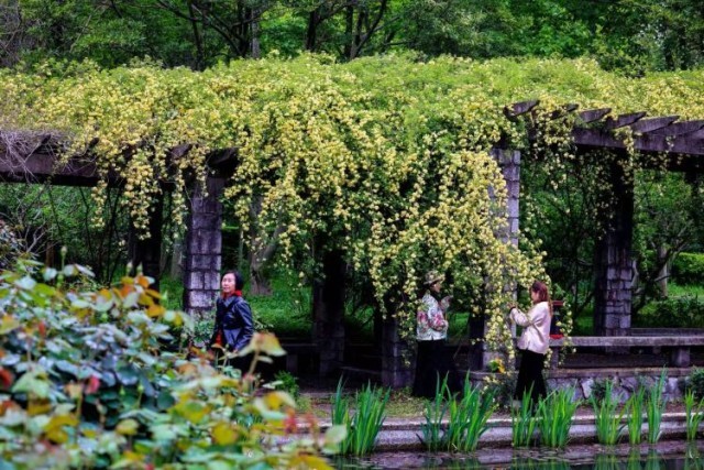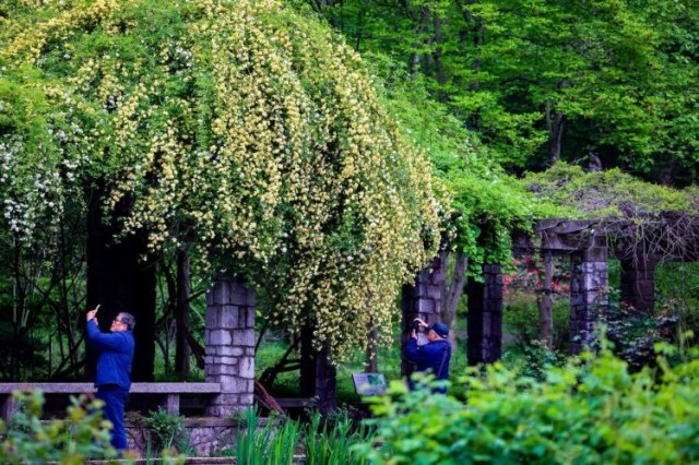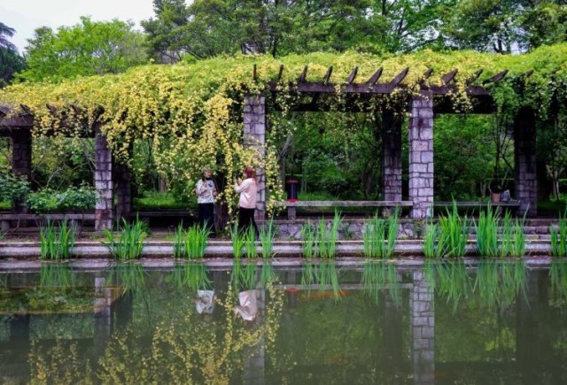 4月14日,南京中山植物园内黄木香正值盛花期。数十米长的藤架上,金黄繁花如瀑布倾泻,层层叠叠蔚为壮观。花瀑、廊柱与池水相映成趣。构成绝美的春日画卷,吸引市民游客前来观赏拍照。(南京日报/紫金山新闻 记者 段仁虎)