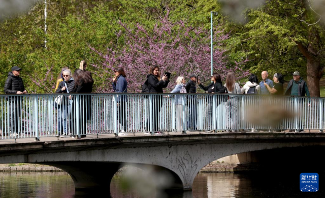 4月14日,人们在英国伦敦圣詹姆斯公园休闲。