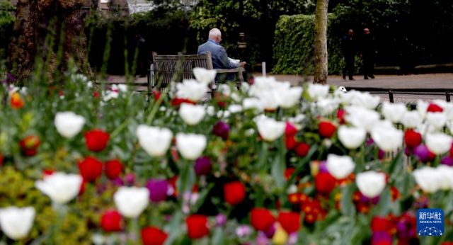 4月14日,一名老者在英国伦敦圣詹姆斯公园阅读。