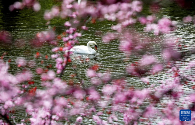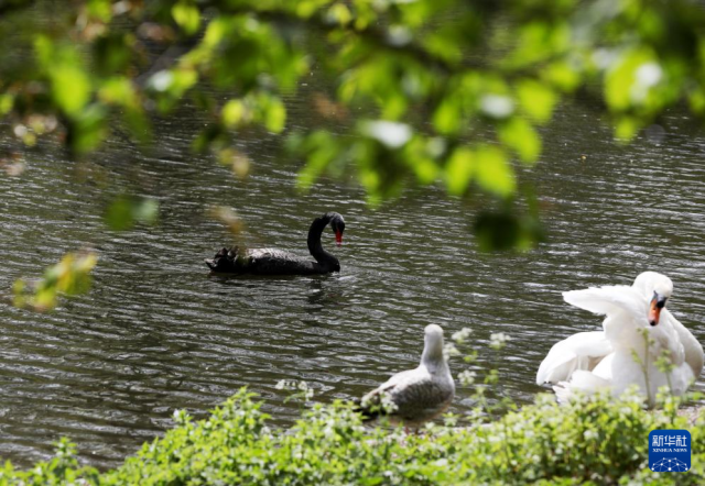4月14日,一只天鹅在英国伦敦圣詹姆斯公园水面上游弋。
