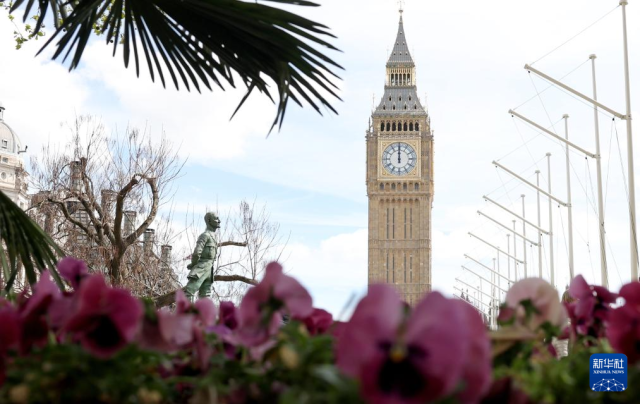 4月14日,鲜花盛开在英国伦敦大本钟旁。