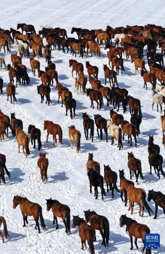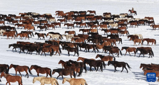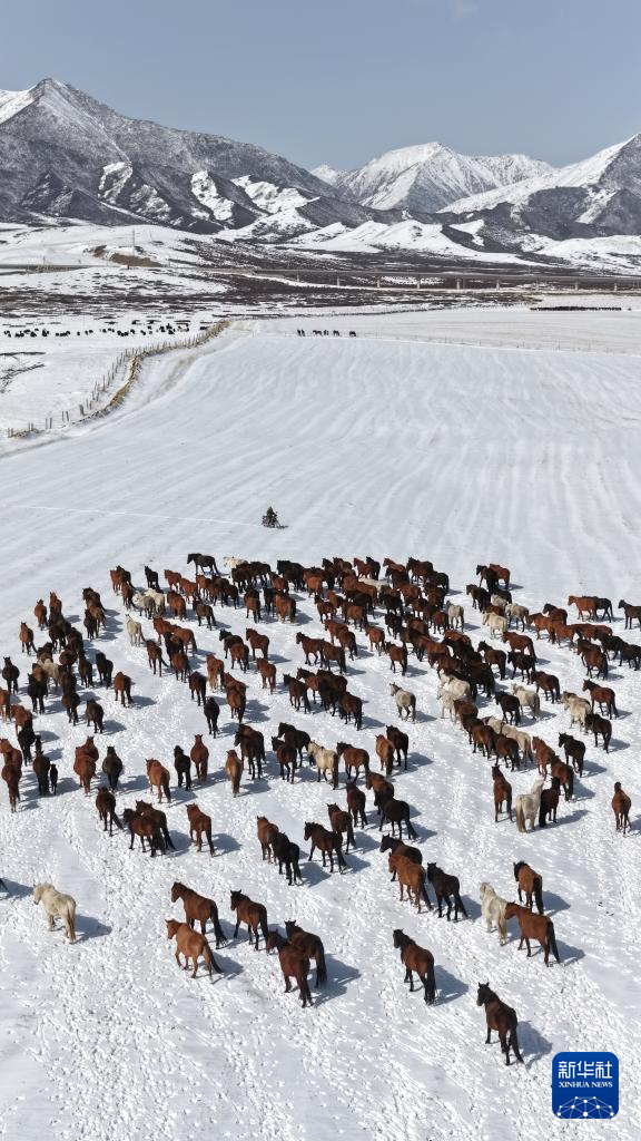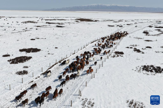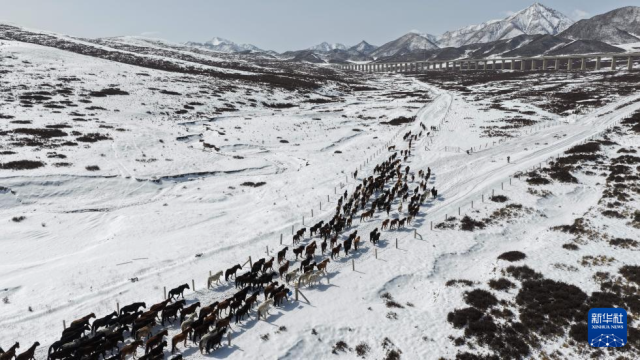 4月14日,山丹马场的牧马人组织马群转场(无人机照片)。