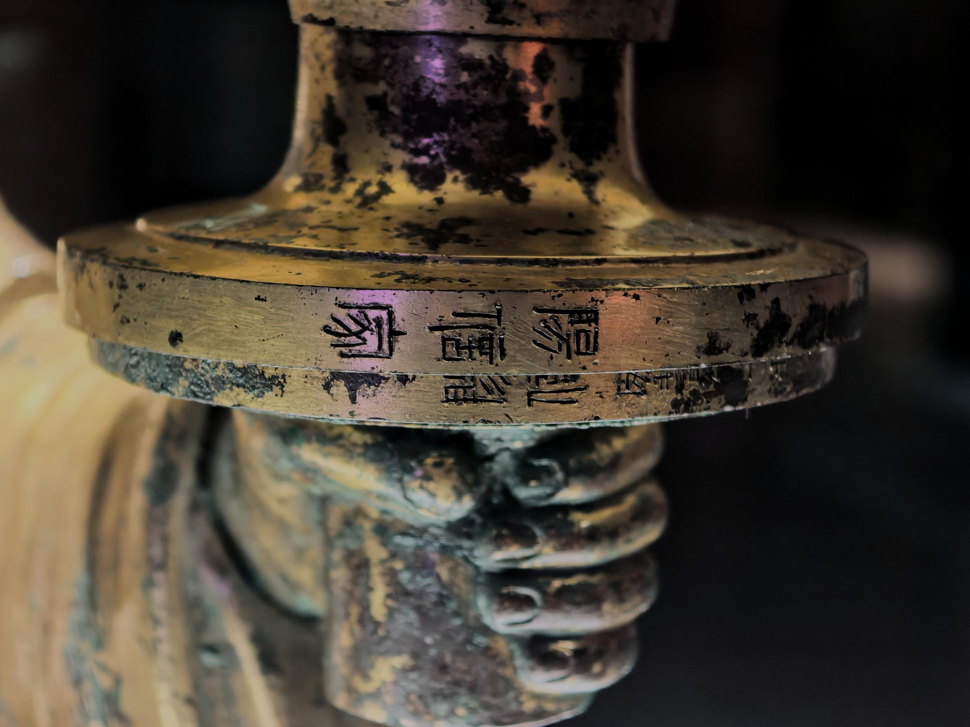 “看,在宫灯上有九处铭文,共计65个字。”策展人吴彧弓介绍,学者据灯身上“阳信家”的铭文推测宫灯原属刘揭家中所有,后来长信宫灯被送入皇太后窦漪的宫殿“长信宫”使用,故增加了“长信宫”字样的铭文以示宫灯易主。造型方面,宫女头梳髻,发上覆巾帼,内穿广袖,外着长袍,衣纹流畅自然,姿态恭谨温婉。